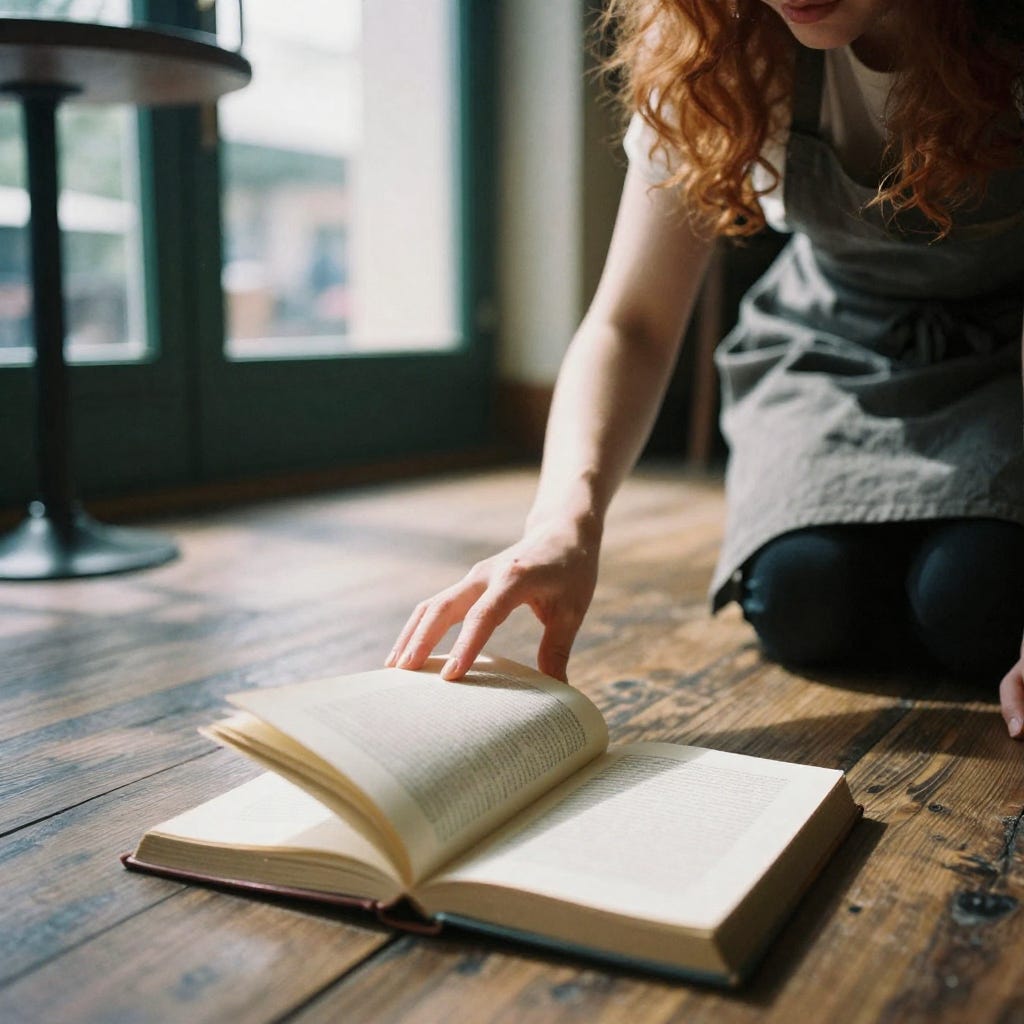 A bit later, as she was arranging the books on the shelves — not alphabetically, but more by instinct — one slipped from her hands and opened on the wooden floor. The spine gave a small sigh, before opening on a familiar page.