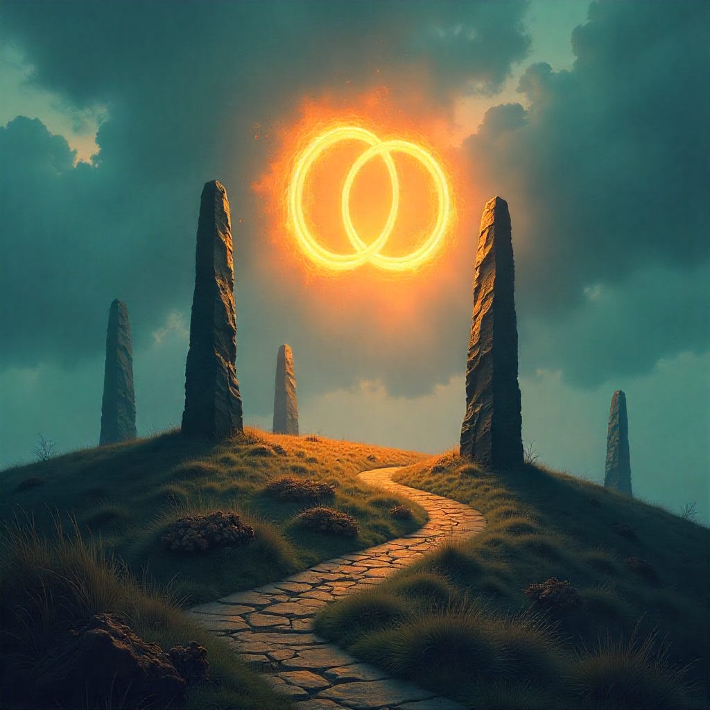 Breathnóir Hill stretched before her, the Obsidian Stones blazing faintly with hidden fire, casting twin circles of light—the inner and the outer—beating like two hearts in opposition against the dark earth below.